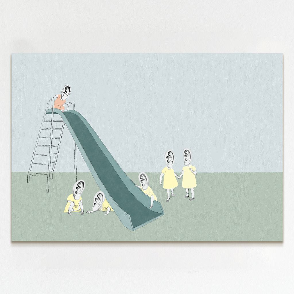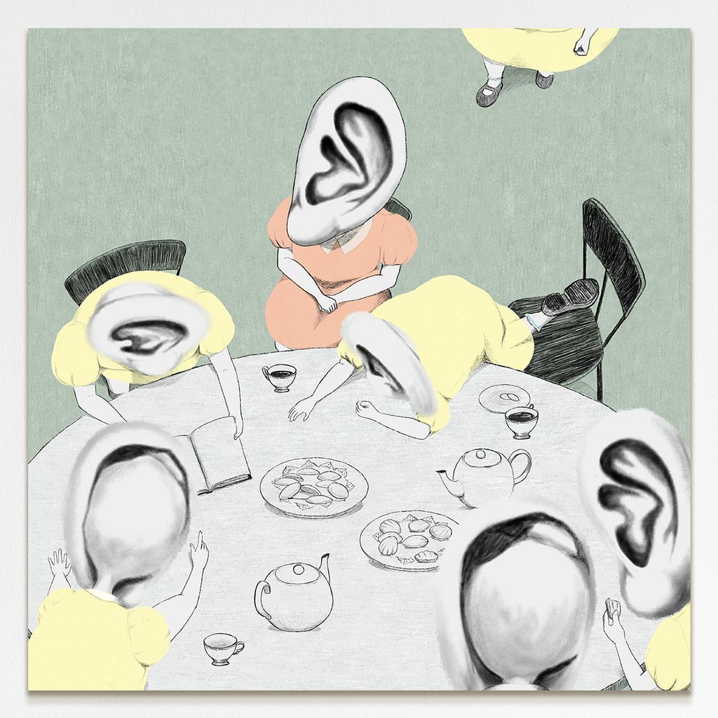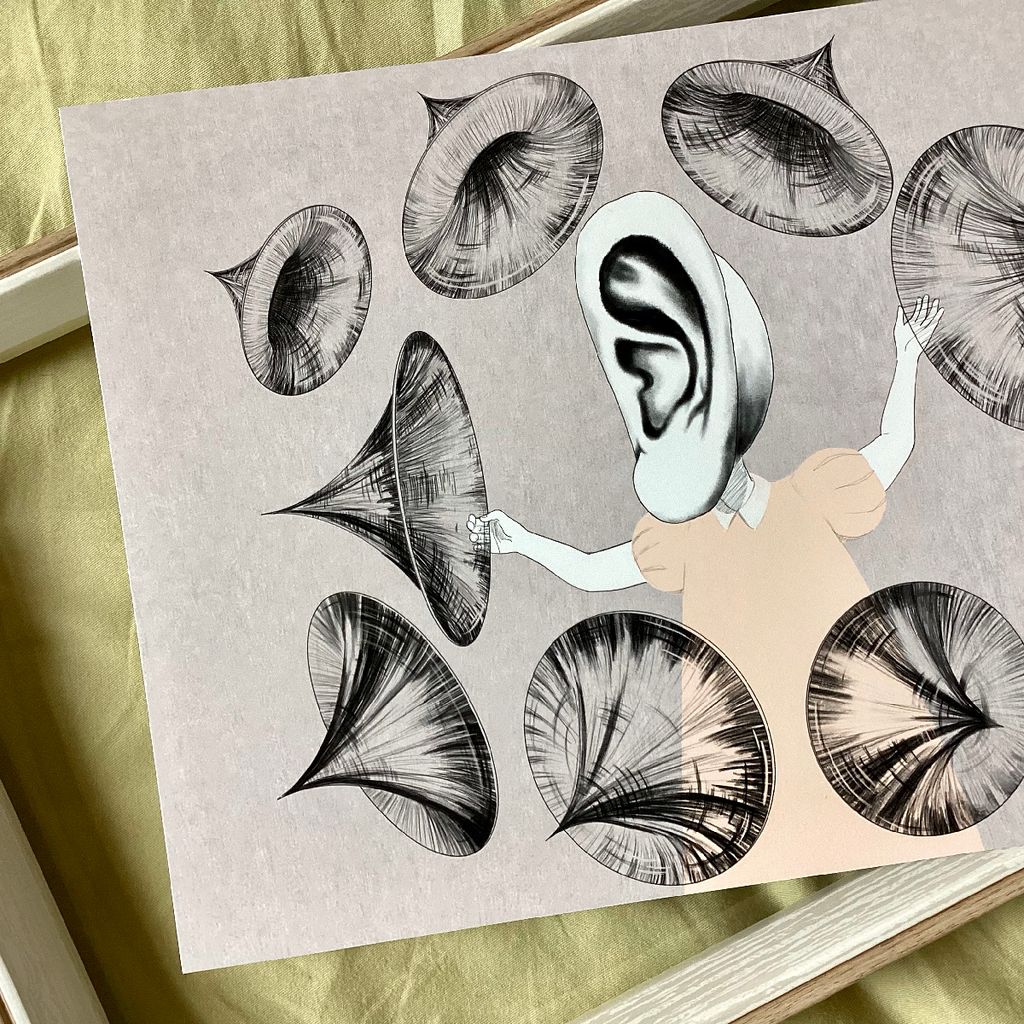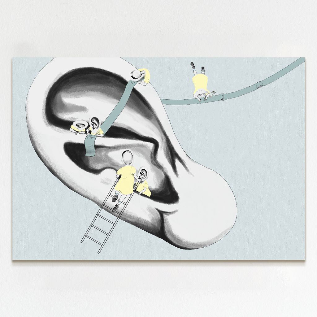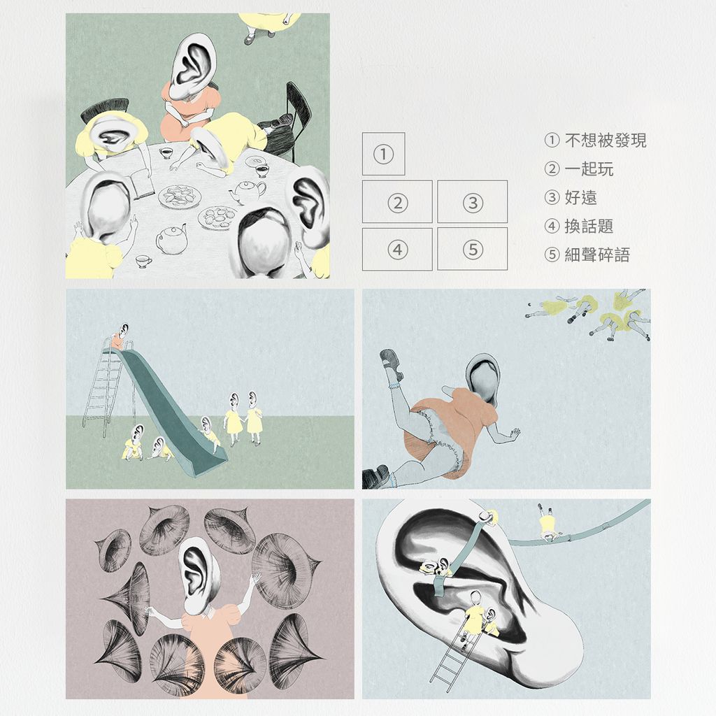 左耳最初獨自揣測,用自己的觀點想像他人,一直以為自己與一群右耳們一起生活。外界的聲音則是邊緣模糊了的右耳們,認為聽不清楚會造成右耳們的困擾。當右耳們主動提出可以幫忙時,左耳也只是被動的接受幫助。最後左耳花了一點時間,透過實際與右耳相處,慢慢開始有了點自己的個性,從右耳的影響中獨立出來,右耳也終於能得知左耳的想法。我認為「自己」是與周遭磨合出的成果,並非屈就環境,而是透過與環境相處才知道自己喜歡與否的事物,我們可能會變得更柔軟與堅強,發現自己樂於分享或自私的地方,外界不會讓我們變得不是自己,每一刻我們都在形成新的自己。